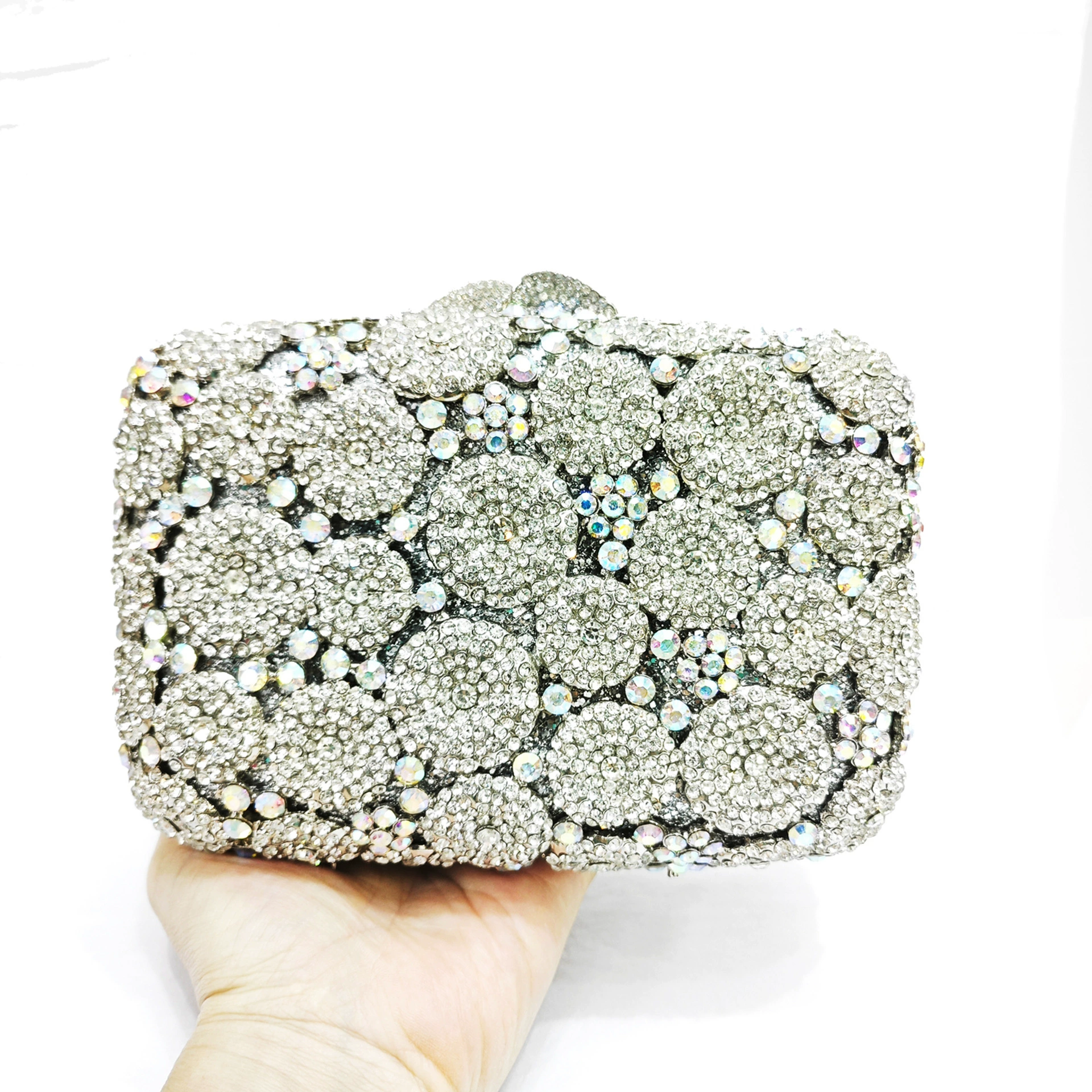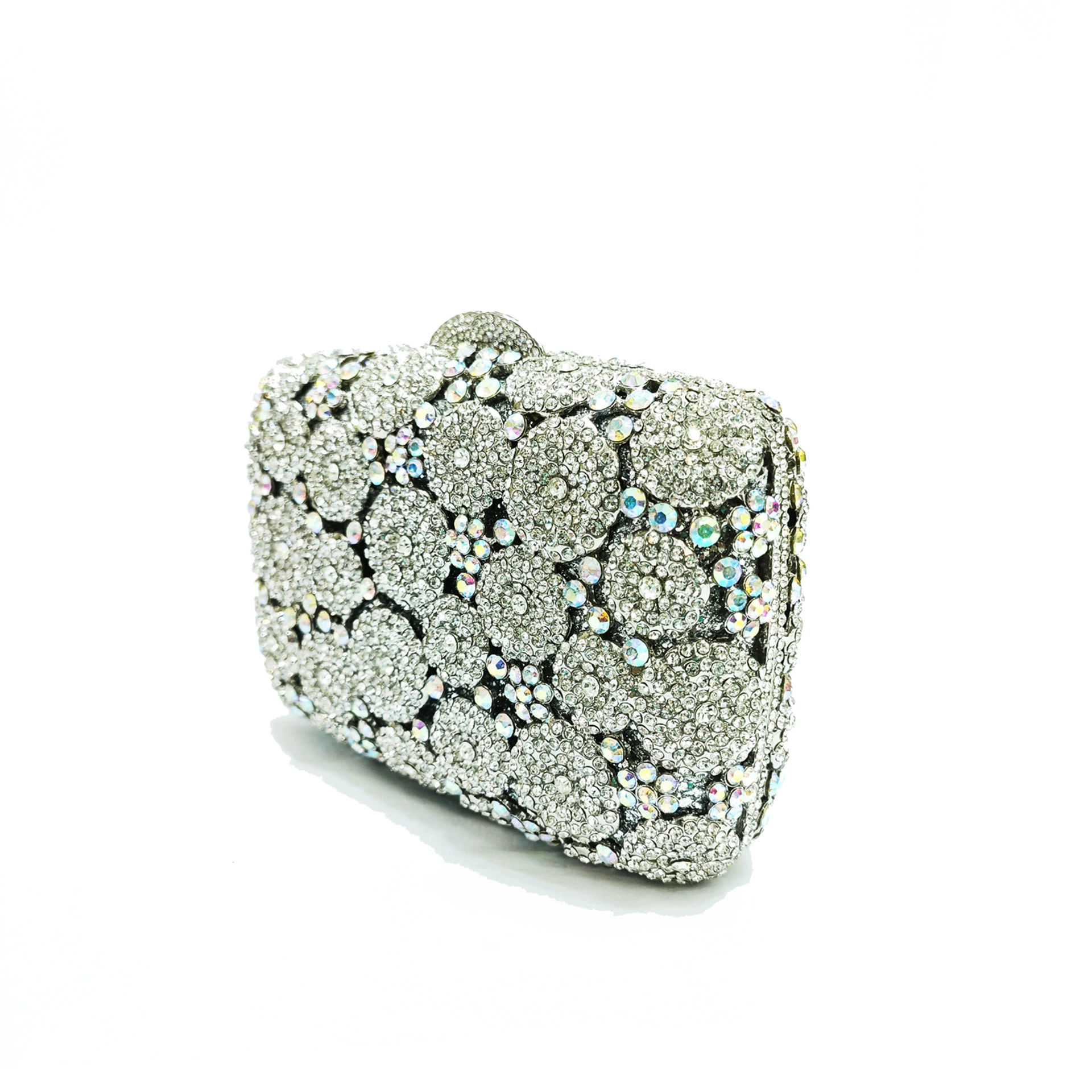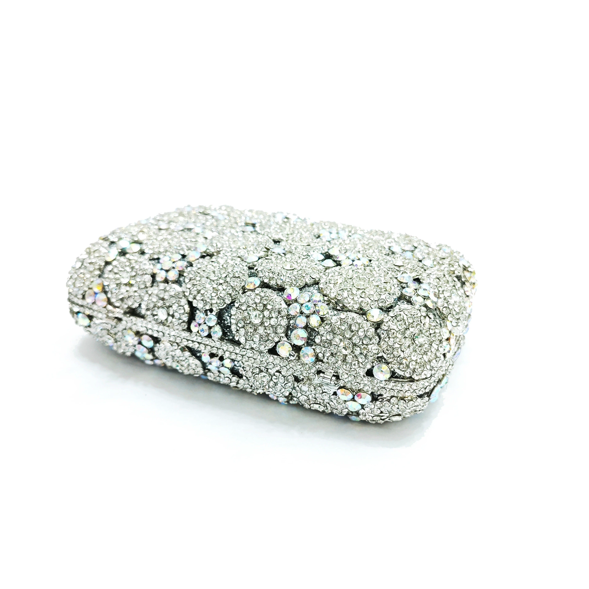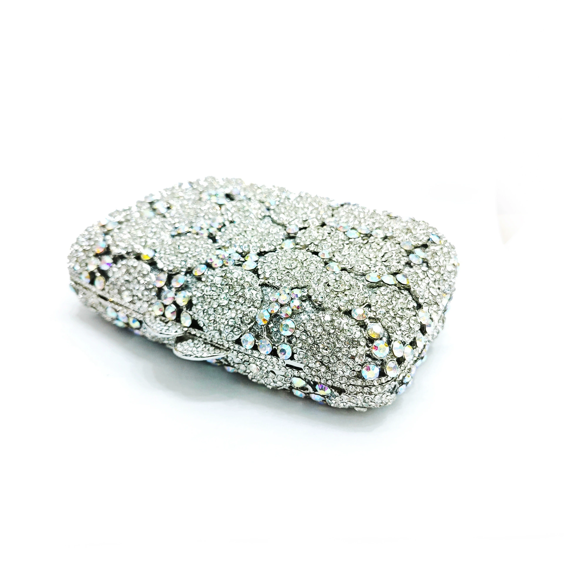 Floral Full Crystal Evening Clutch Bag — an exquisite crystal clutch bag, meticulously handcrafted with sparkling rhinestones and intricate hollow-out metalwork.