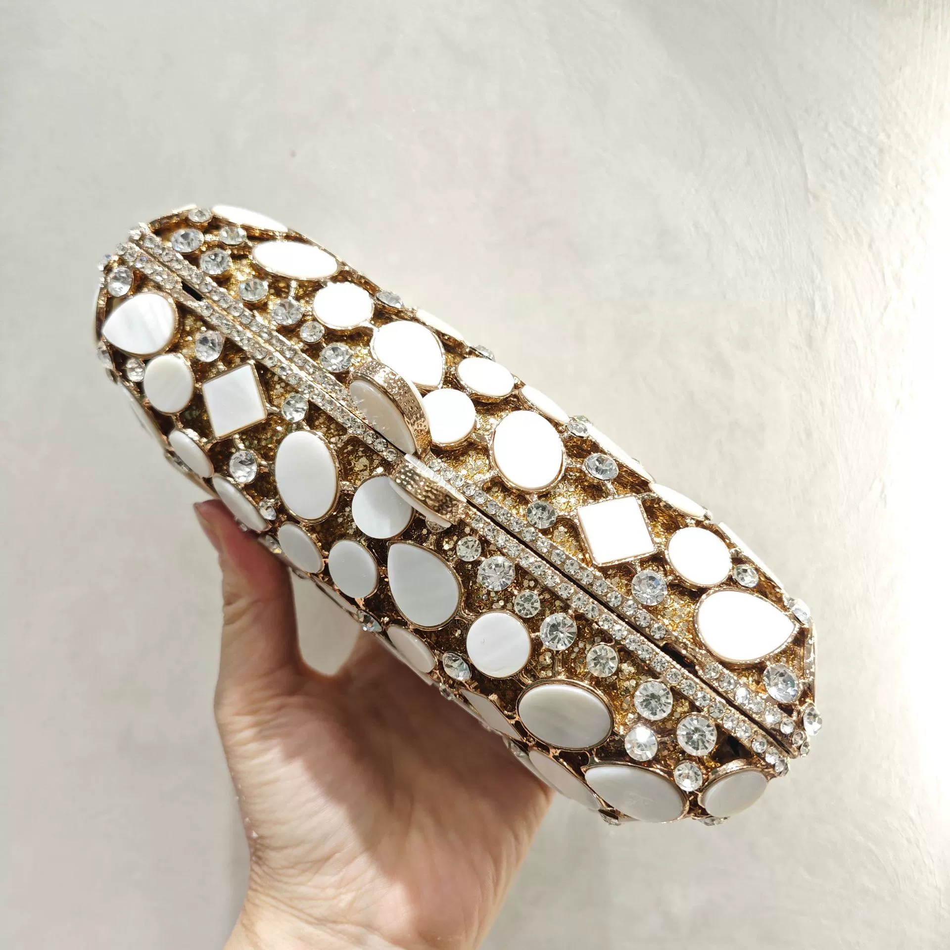 Shell Hollow-out Full Crystal Crystal Evening Clutch Bag — an exquisite crystal clutch bag, meticulously handcrafted with sparkling rhinestones and intricate hollow-out metalwork.